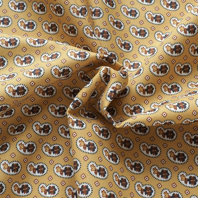 Provincial style 1800s reproduction print featuring paisley motifs, set against a rich golden background.