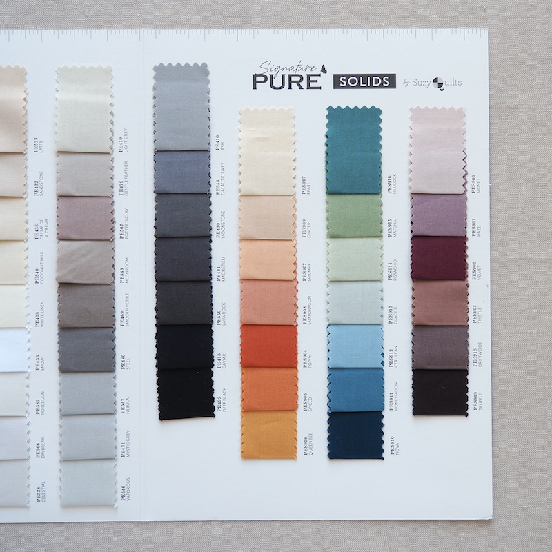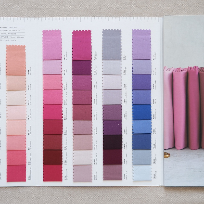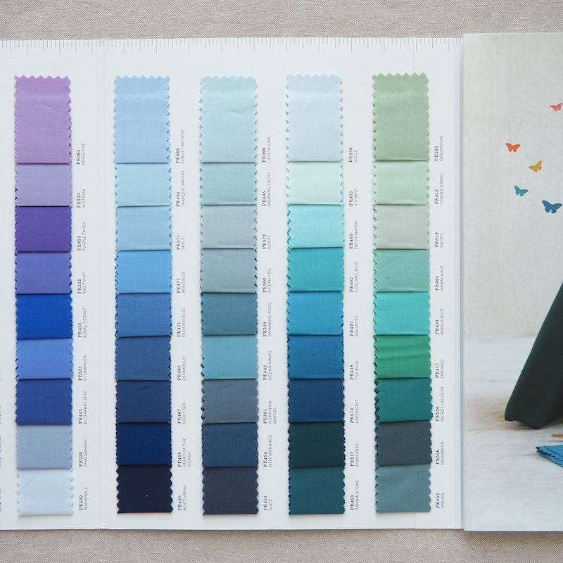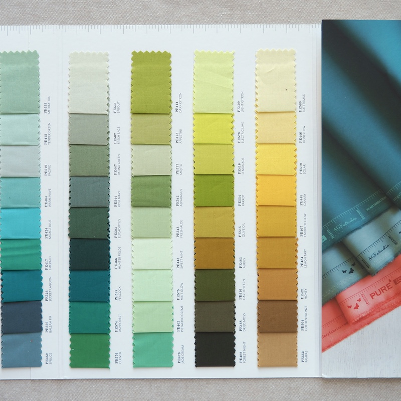 Find your exact shade needed for your next project with Art Gallery Fabrics, Pure Solids colour swatch book. The latest version includes swatches and reference names for 182 colours in the premium cotton range, including colours 400-582.