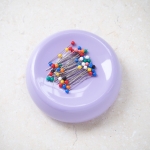 Package contains a 4" round magnetic pincushion and fifty plastic head pins. Made in USA.