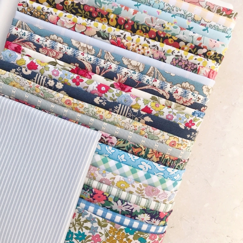 (24) Fat Eighth fabrics measuring 9" x 21” each, includes a range of Liberty tana lawns and quilting cottons. Background fabric, Kona Snow 2-3/4 yards. Binding fabric, Liberty Gilbert B (replaced from original blue stripe as shown in photo) 1/2 yard. Quilt pattern, which provides full colour instructions, cutting layouts and assembly diagrams.