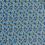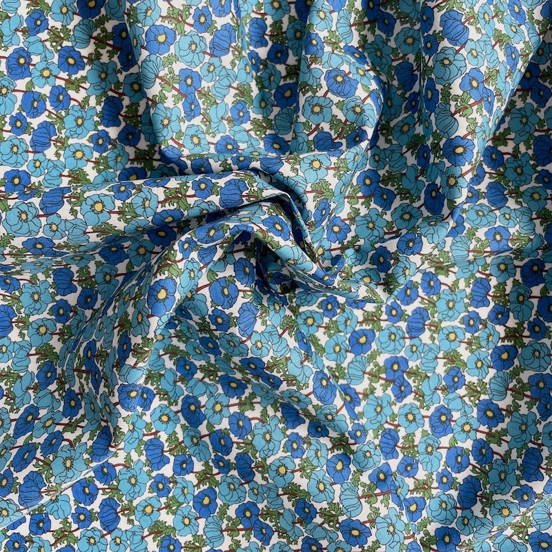 Charmian draws us into an infinite meadow of stylised poppies, with a seamless floral repeat. Originally hand-painted in the Liberty studio in 1966, this subtle vintage pattern is drawn with fine outlines and accents of bold, flat colour. Shown here in a blue colourway on a white background.
