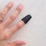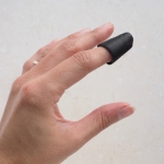 Perfectly suited for hand quilting, the Nimble thimble is made from lightweight leather and features a handy opening slot at the top to accommodate a fingernail. Available in two sizes, small and medium. Photo's show the small size in use.